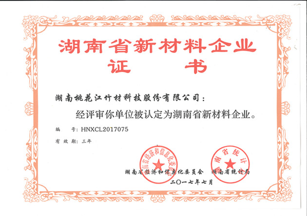 2017年7月,湖南省經(jīng)濟和信息化委員會、湖南省統(tǒng)計局為湖南桃花江竹材科技股份有限公司正式頒發(fā)“湖南省新材料企業(yè)”證書(證書編號:HNXCL2017075)。湖南省新材料企業(yè)的認定,標志著湖南桃花江竹材科技在新型竹材領域的成績得到國家認可與支持,是一項具有含金量的突破性榮譽。作為中國竹業(yè)龍頭企業(yè),湖南桃花江竹材科技一直走在新型竹材研發(fā)、運用和推廣的前沿,為全球竹產業(yè)的發(fā)展持續(xù)貢獻力量。