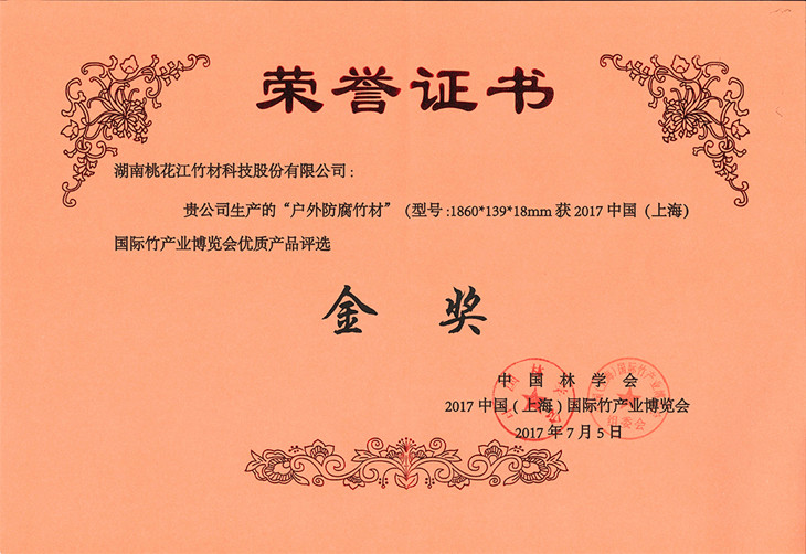 湖南桃花江竹材科技股份有限公司生產(chǎn)的戶外防腐竹地板在2017年7月中國(上海)國際竹產(chǎn)業(yè)博覽會中榮獲金獎,該獎項由中國林學會、中國(上海)國際竹產(chǎn)業(yè)博覽會頒發(fā)。湖南桃花江竹材科技作為中國竹材領域高炭防腐技術的發(fā)明者,在中國竹材領域有著舉足輕重的地位。湖南桃花江竹材科技一直專注與于竹材的戶外運用研發(fā)與創(chuàng)新,為全球客戶提供優(yōu)質(zhì)竹材。